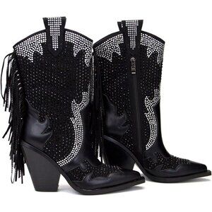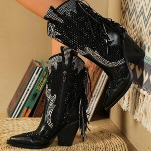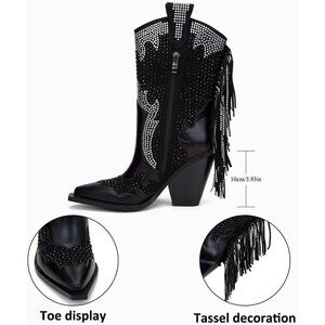 Feinlina Black Western Cowboy Boots Women Pointed Toe Chunky Heel Tassel Style