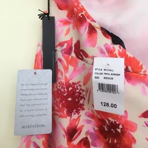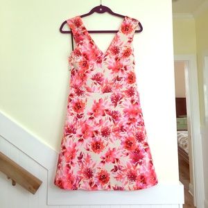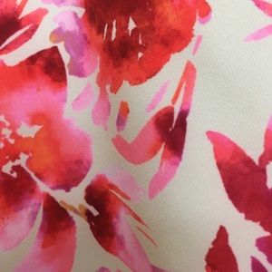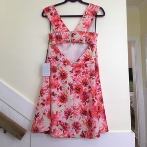 Silky ivory and pink floral skater style dress with back cut out and bow detail. Very flattering cut and fabric. Worn once for only a couple hours, so no longer has any tags. Would be a perfect wedding guest dress!