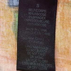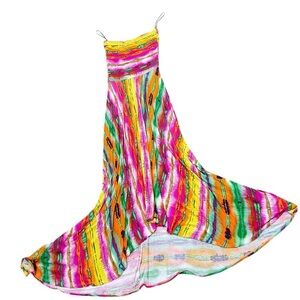 This strapless sundress by Felicity & Coco features a vibrant pink and yellow watercolor pattern, perfect for resort wear. The high-low hemline adds a touch of elegance, while the sleeveless with ruched cutout design and flowing silhouette ensure comfort and style. Ideal for sunny getaways, this dress captures the essence of summer with its cheerful color palette. Can be worn with cutouts in front or back. Euc