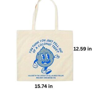 Celebrate the iconic "You think you just fell out of a coconut tree?" with this stylish and witty tote bag inspired by Kamala Harris. Made from 100% cotton canvas, this tote bag features a natural color with a bold blue print of a quirky coconut character and the phrase, "You think you just fell out of a coconut tree? You exist in the context of all in which you live and what came before you." This bag is both a fun conversation starter and a practical accessory for everyday use.