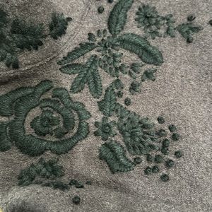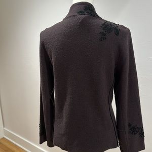 Purplish brown color with black embroidery detail. Double button. Very pretty.