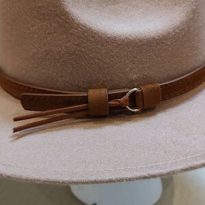 Felted Tan Fedora Hat with a Brown Fringed Belt Hatband. Molded Fedora style hat with an interior adjustable black band for comfort while wearing. 35% cotton and 65% polyester.
