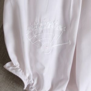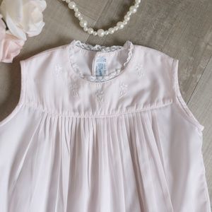 This RARE Vintage Newborn Feltman Brothers baby girl sleeveless romper is PRECIOUS and SPECIAL! The sweet blush pink bubble has unique details which haven't been seen in decades. The sweet neckline is trimmed in a delicate French lace. The arm openings have a matching piping trim. The upper bodice has a yoke with hand embroidered petite white floral stems with pink centers. Just below the the yoke is a tiny border of matching piping with baby pleats that span across the chest and fall into soft pleats down the front of the romper. Just above the right leg opening is a hand-embroidered flower cart with flowers that match the embroidery at the top of the bodice. Super Cute, Rare Feature!!! The leg openings have elastic and finish off with small ruffle hems. The back has a yoke with a 2-button closure with petit white pearlized buttons. Snap inseam for easy diaper changes.Vintage New With Tags! Original Feltman Brothers with tag and vintage sticker. Perfect Condition! Such a Sweet Delicate Piece!