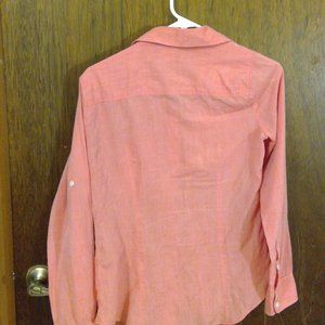 100% cotton salmon button down shirt. Sleeves have buttons to assist in shortening the sleeves. Very lightweight for outdoor or indoor challenges. Sometimes work can be a jungle! Just needs to be ironed.
