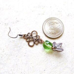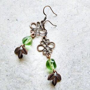 Copper Celtic Knot Elements + Leaf Charms with a bright green glass bead. Simple hypoallergenic coated copper earwires.