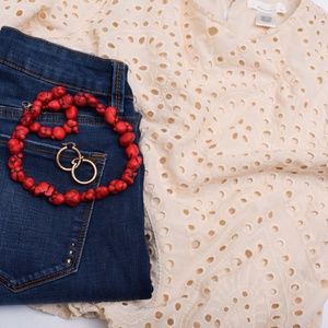 I paired this top with a pair of Lucky Brand Jeans, a red turquoise necklace, and gold hoops just for fun, add cowboy boots, and a jacket.
