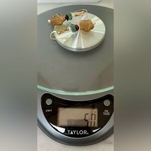 These elegant fluorite earrings feature a beautiful floral design in gold and green tones. The ear wires are 14 KGP with copper tone and pearl spacers.