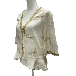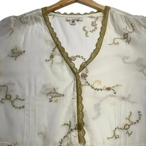 Feminine Light Cotton Deep V Short Sleeve Embroidered Button Closure Scalloped