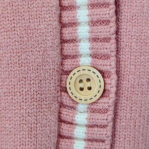 A soft pink and white stripe button-down cardigan in medium size that effortlessly transitions from library study sessions to casual first date nights. The thicker material provides comfortable warmth while maintaining a light, feminine aesthetic. This would be lovely for Valentine's Day or a cool spring day.