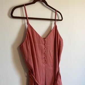 Tank style ; Adjustable spaghetti straps ; Fabric button top ; Waist darting (one minor imperfection in this area - pictured) Waist tie ; lined ; knee length