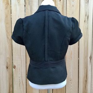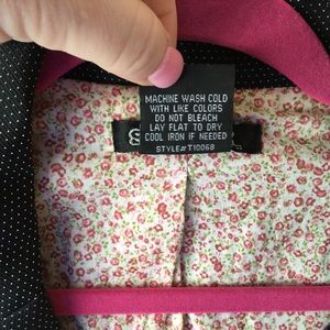 Feminine style black blazer with tiny white dot pattern, pink flower lining, notched lapel and tie closure in the front with a bow. Measurements: Chest 18" flat, pit to pit. Waist 16" flat, pit to pit. Length 23" neck to hem. Excellent like new condition, worn 1-3x. No damage.