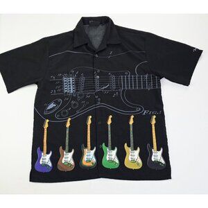 The Fender Medium Men's Black Embroidered Sleeve Logo Guitar Front and Back V-Neck shirt is a versatile and stylish addition to any man's wardrobe. Made from polyester, this short sleeve button-up shirt features a striking graphic print with embroidered accents, perfect for music lovers and guitar enthusiasts. The V-neckline and spread collar add a touch of sophistication, suitable for various occasions from casual to formal. Machine washable and in all seasons, this regular fit shirt is a must-have for those who appreciate quality and style.