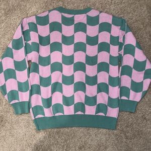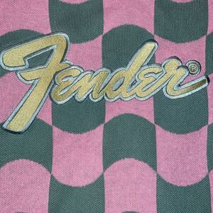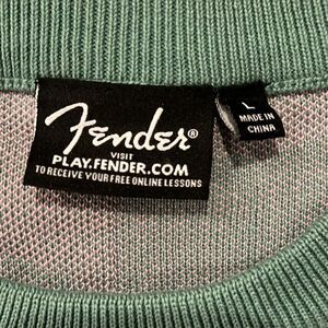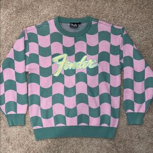 Fender embroidered Sweater, size L for sale. This shirt features an embroidered Fender logo on top of a groovy pink and green wavy pattern. Excellent overall condition, perfect for any musician or fan of Fender guitars!