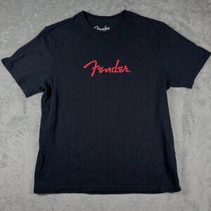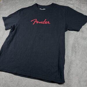 Fender x Lucky Brand graphic tee featuring a vivid red Stratocaster guitar print on black soft cotton. Comfortable fit, quality fabric, and clean screen print design. Excellent pre-owned condition with no flaws.
