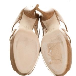Tan suede and patent leather Fendi platform sandals with cutouts throughout, stacked heels and midsoles and zip closures at counters. Includes box and dust bag