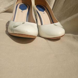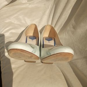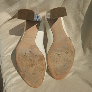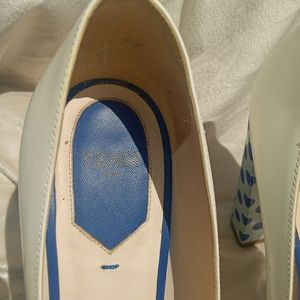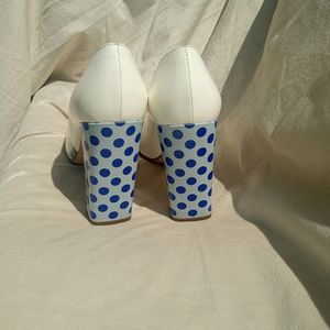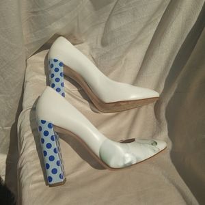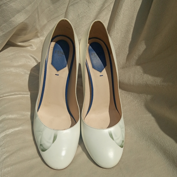 A pair of Fendi Block Heels. White leather with Faint Floral design and blue polka dot block heels. In EUC with 4.5 inch heel. They feel narrow width(inside) is 3 inches and Length(inside) inside is 10 inches from toe to heel. Offers are welcome and thanks for stopping by.