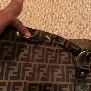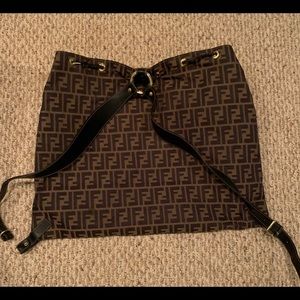 Large Fendi Backpack. I used for flights the strap needs to be repaired at the buckle. The draw string has wear and tear. Other then that it’s in pretty good condition.