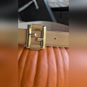 Elegant Fendi belt in beige. Features gold accents. Adds sophistication to any look.