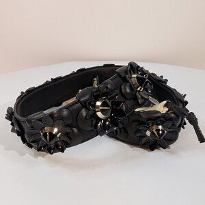 This striking Fendi bag is the Baguette Trunk Mini, a highly structured and boxy version of the iconic Baguette silhouette. The bag is crafted from a durable FF (Zucca) monogram jacquard canvas in black and grey, trimmed with black leather. A distinguishing feature is the extensive stud detailing, with small, silver-toned studs along the edges of the leather trim. It is finished with polished silver hardware, including metal corner protectors and a prominent FF buckle on the front flap. The bag comes with an amazing ornate black leather "Strap You" shoulder strap, decorated with flowers and studs. This strap is an upgrade from the basic leather strap that typically came with the Trunk Mini. The strap itself initially sold separately for $1250, but immediately sold out. The Baguette Trunk Mini represents a bold, modern interpretation of a classic design, blending a vintage trunk aesthetic with Fendi's iconic branding and contemporary hardware and strap. The bag and strap are in excellent preowned condition, and they come with box and dust bag.