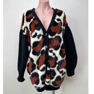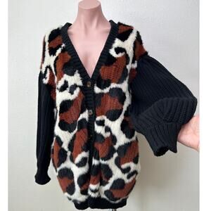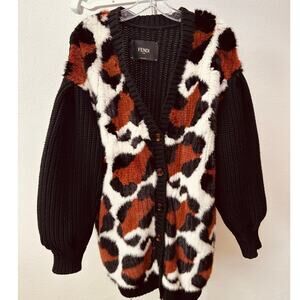 This luxurious Fendi cardigan showcases the brand’s signature mix of opulence and modern design. Crafted in Italy from a soft cashmere and wool knit, it features voluminous balloon sleeves and a plush mink fur front in a striking white, brown, and black animal print pattern. The design includes front button closures and practical side pockets, blending comfort with couture craftsmanship. Perfect as a statement layering piece for cold-weather dressing or elevated casual looks. Good used condition with minimal signs of wear; fur is soft and glossy, knit is clean and intact.
