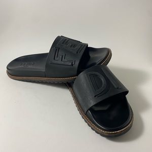 Stylish black slide sandals. Embossed Fendi logo. Comfortable and sleek design.
