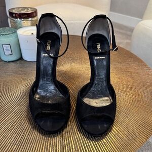 Fendi Black Suede Statement Heels with Gold Plating - Size 38