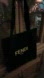 This is a black fabric tote from Fendi. The name is on both sides in white-ish cream. Below are the approximate dimensions. Thank you for looking.