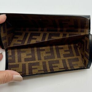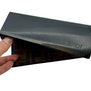 Unique style of case. This is a Twist Angle Fendi Black Hard Faux Leather Sunglass Eyeglass Case. The Lined Interior is the Fendi Logo in Brown and Black. . Light Scratches on exterior.
