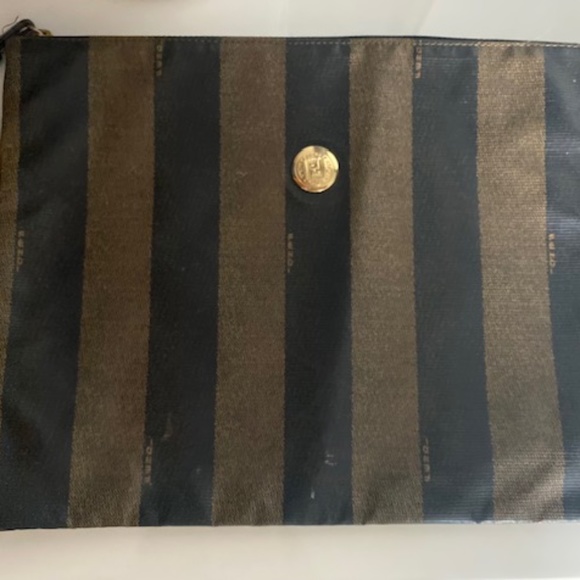 Elegant Fendi clutch with bold black and brown stripes. Features a gold-tone logo accent. Perfect for any occasion.