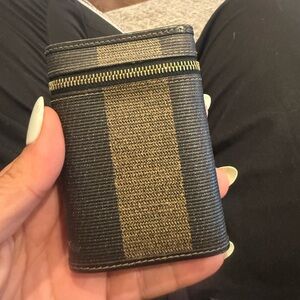 Elegant Fendi key holder with gold hardware. Features a sleek black and gold striped design.