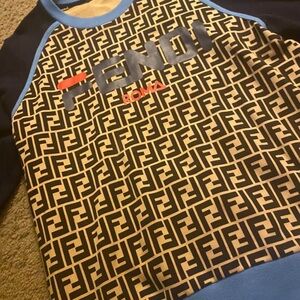 Fendi sweatshirt with bold logo design. Features blue sleeves and black pattern.