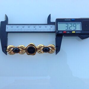 This is an amazing retro piece which recalls the gold Bar Brooches of the Victorian Period. Fendi has here revisited the classic form with a late 80s/ early 90s sensibility. It is a long brooch, intended for horizontal wear (but of course, the wearer's desire governs) The brilliant yellow gold hosts three jet black stones, the outer stones being black rounded smooth cabochons and the central stone being an intaglio stone, sporting the Fendi Crown and the FF logo. The intaglio is apparent only in just the right light, otherwise it presents as a plain black stone. An abundance of measurements and comparatives are provided in the pics provided. Such a classy piece. An This exemplar is marked at rear, "Fendi". and the condition of the item is excellent.
