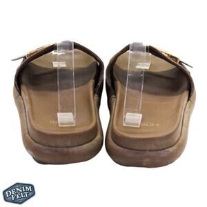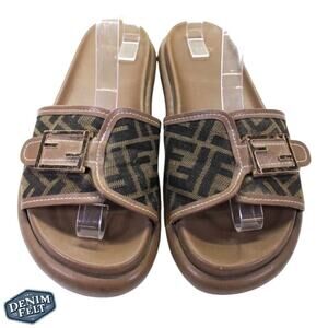 Fendi Brown Wide-Band Leather Zucca FF Logo Monogram Flat Slides | Size: 8
