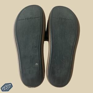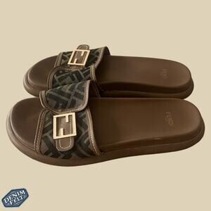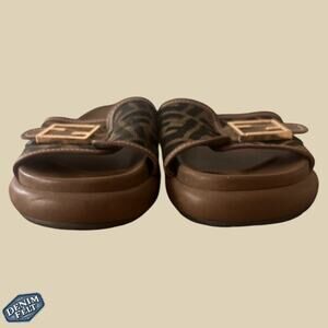 Fendi Brown Wide-Band Leather Zucca FF Logo Monogram Flat Slides | Size: 8