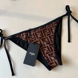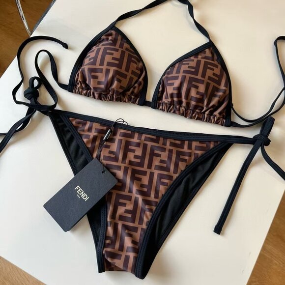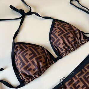 Stylish Fendi bikini set in brown and black. Features iconic logo design.