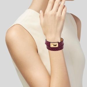 AMAZING, Fendi, substantial, burgundy snakeskin leather, wrap around style, buckled bracelet with a large, gold, 'Fendi' engraved, push button clasp that meets at the center! This bracelet has a high-end bohemian look from Fendi that is completely on trend! 14.75"L x 0.25"W x 0.7"H. All measurements are approximate. Item #: 24246140.