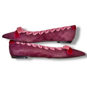 Fendi Burgundy Suede Velvet Ribbon Stitch Bow Pointed Toe Ballet Flats Size 38