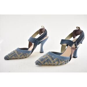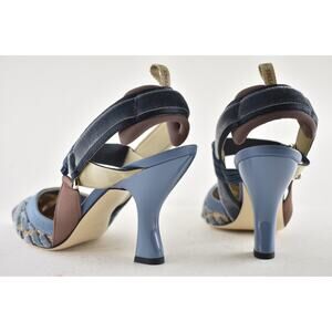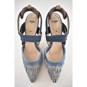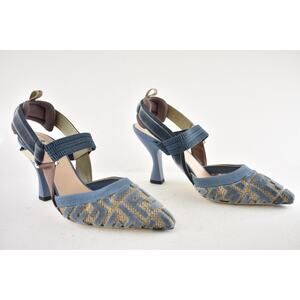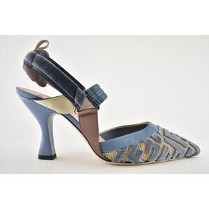 Fendi Colibri Lite 85mm Blue Velvet Beige FF Logo Pointed Slingback Heel Pump 40
