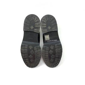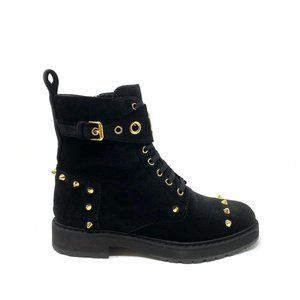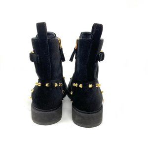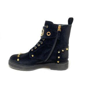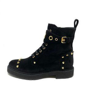 Black Fendi combat boots in velvet with FF buckle at front, gold studs and lace up closure. Includes box and dust bag.