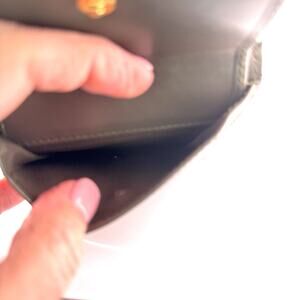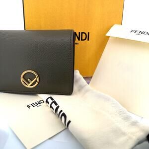 This sophisticated Fendi compact wallet is crafted from smooth olive green calfskin leather and finished with the signature Fendi circular “F” logo in gold-tone metal. The interior offers a bill compartment, multiple card slots, and a coin pocket, blending Italian craftsmanship with everyday functionality.