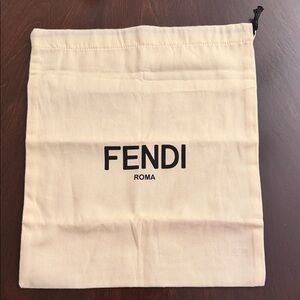 Elegant Fendi drawstring bag. Cream color with black logo. Perfect for storage or travel.
