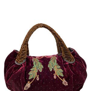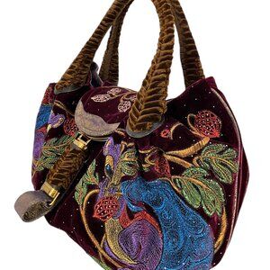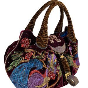 Add to your collection this awesome Limited Edition Fendi Embroidered Squirrel Spy Bag carried by many celebrities. Expertly crafted from a squirrel motif embroidered burgundy velvet and gold-tone hardware. Featuring brown woven velvet handles and two secret compartments; one on the flap closure and one on the braided handle. The interior is roomy enough for all your daily essentials.