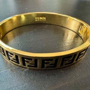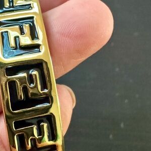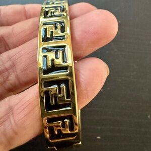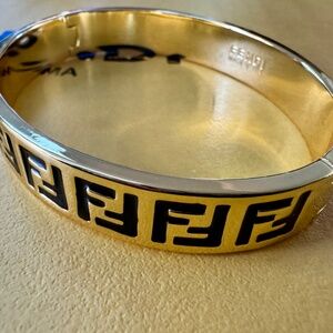 Elegant and timeless, this authentic Fendi FF Forever bangle features a luxurious gold-tone metal accented with sleek black enamel detailing. The iconic FF logo design adds a signature touch of sophistication, making it a perfect statement accessory for any outfit. The smooth, polished finish and sturdy hinged closure ensure both comfort and durability. Ideal for stacking with other bracelets or wearing solo for a refined, modern look.