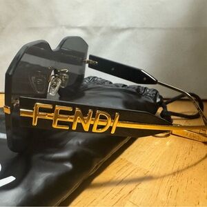 Rectangular Fendigraphy shield sunglasses inspired by the Hobo bag. Temples with in-line gold-colored metal Fendi maxi lettering. Black lenses. Adjustable nose pads.