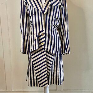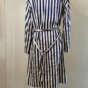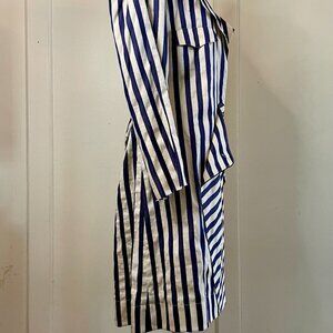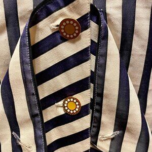 This is a vintage Fendi French military style duster coat in a size small/medium. Made in France, the coat features a striped pattern in blue, with military jacket accents like gold buttons buttons and cut. The coat is designed with a regular fit and a stylish military theme, perfect for women looking to add a touch of army-inspired fashion to their wardrobe.