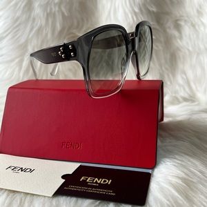 Brand new and authentic Fendi hologram sunglasses. Has oversized Gradient square frames, Grey/Gold Decor, Fendi Hologram print logo on the lenses, and buckles at the temples for a head-turning statement. Comes with Fendi case, polishing cloth and authentication card (color of case and polishing cloth may vary).