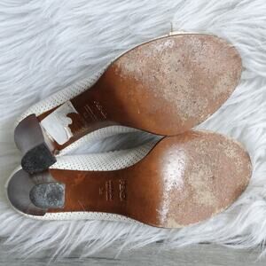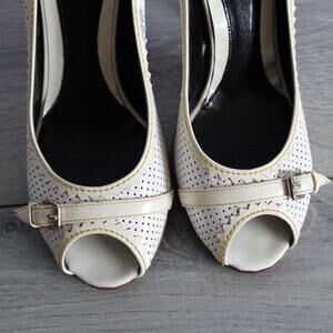 Fendi Cream White Perforated Patent Leather Buckle Peep Toe Wooden High Heels