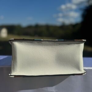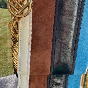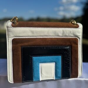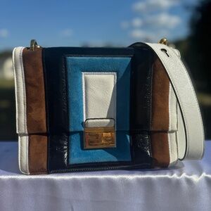 A true collector’s piece, this Fendi Kan I bag pays tribute to the iconic FF logo introduced in 1965 — a design that has defined the house for decades. This multicolor patchwork version combines smooth leather, glossy patent, and rich suede in geometric blocks of teal, white, brown, and black. Finished with the signature FF clasp, it carries the unmistakable stamp of Karl Lagerfeld’s final creative contributions to Fendi, blending heritage with bold modernity.