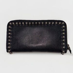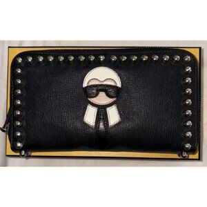 Fendi Karlito Long Studded Black Saffiano Zip Wallet In Original Box. Authentic