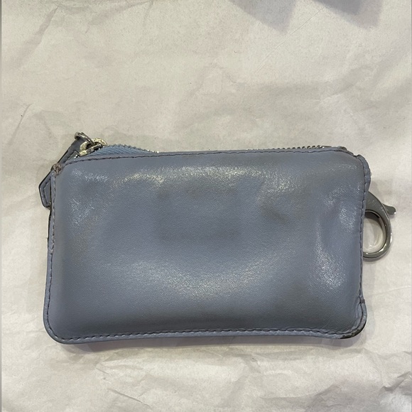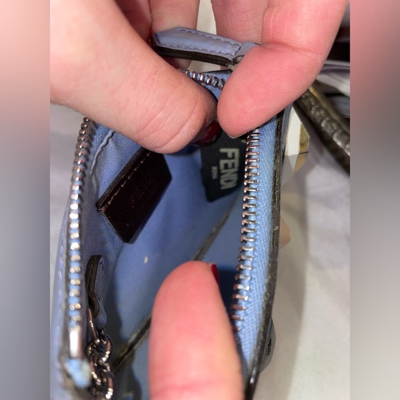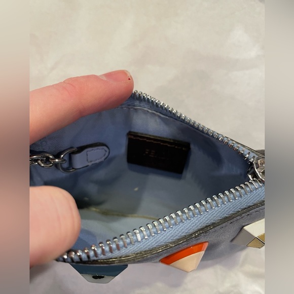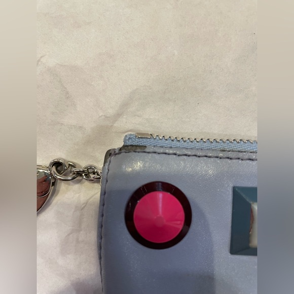 Super adorable Fendi key chain wallet! Has some corner wear as shown in the pictures and one of the gems/charms has a few nicks in it. Overall a lovely little wallet and has plenty of uses left in it!